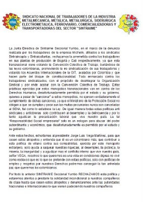 La Junta Directiva de Sintraime Seccional Yumbo, en el marco de la denuncia realizada por los trabajadores de la empresa Michelin, afiliados a los sindicatos Sintraincapla y Sintraicollantas, rechazamos la arremetida contra los trabajadores en sus plantas de producción de Bogotá y Cali respectivamente, ya que esta transnacional viene violando la Convención Colectiva de Trabajo, burlándose de las leyes colombianas, promoviendo la no sindicalización de sus trabajadores y violando los Acuerdos Internacionales de la OIT, avalados por Colombia y que hacen parte del bloque de constitucionalidad. Todo enmarcado contra los trabajadores sindicalizados, con el propósito de desintegrar la Organización Sindical y por ende acabar con la Convención Colectiva de Trabajo. Estas prácticas ejercidas por estos monopolios transnacionales van en contra de los Derechos Humanos, desafortunadamente permitido por el estado y su gobierno, quienes a pesar de “sancionar” a estos monopolios, no ejercen verdaderamente el cumplimiento de dichas sanciones, ya que el Ministerio de la Protección Social no obligan a que se cumplan y peor aun las multas pecuniarias nunca son canceladas al SENA, tal como lo establece la Ley. De igual manera todas estas políticas anti sindicales y antiobreras solo contribuyen al desempleo y la delincuencia y por lo tanto agudizan la precarización laboral que vive nuestro país. La tal “Responsabilidad Social empresarial” solo es un eslogan para abusar del poder subordinante y económico, que desafortunadamente es permitido por el estado y su gobierno.